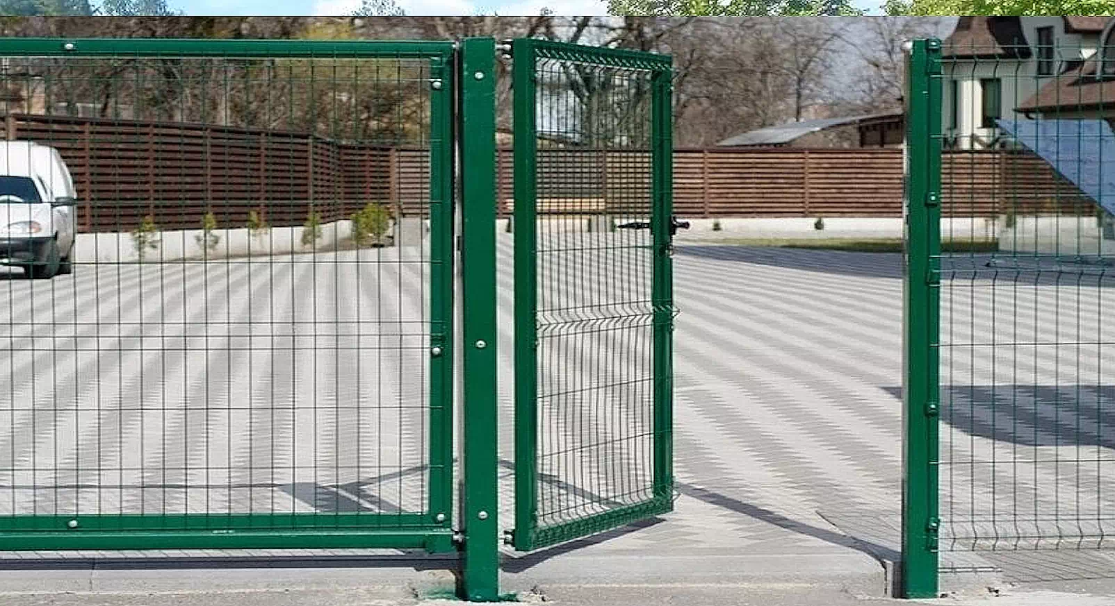 Калитка из профиля 40х40мм., потому что у сетчатых панелей нет никаких ветровых нагрузок и сама по себе 3д сетка не тяжелая. Из-за чего, укреплять ворота и калитки сверх норм не нужно, это просто необоснованное удорожание.